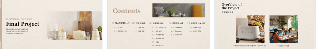 설계의 주안점 설계의 주안점은 스메그 코리아 사이트를 레퍼런스로 삼아 전체 팀원들이 스터디를 하여 프로젝트 전체 과정을 서로 공유, 학습하며 전반적인 실력 향상을 도모하는 것입니다.