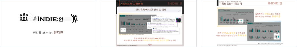 개요 국내 외 인디 음악에 대한 관심도가 집중되는 환경 속에, 높아지는 관심도와는 다르게 낮아지는 오프라인 관람 비중과 관련 콘텐츠 및 플랫폼의 부족으로 이용 가능성과 접근성 간의 격차가 발생하고 있다. 이는 실력 있는 인디 아티스트들이 자기 자신을 홍보하는데 어려움을 겪게 하였고 그로 인해 인디 아티스트들의 경제적 어려움이 가장 큰 문제가 되고 있다. 이를 해소하고자 대중과 인디 아티스트를 연결하는 플랫폼 ‘인디안’을 기획하였고 해당 서비스에서는 무자본/소자본 아티스트들의 음악 활동을 위한 펀딩과 대중들을 위한 리워드를 제공함으로써 아티스트들의 홍보와 수익 발생을 기대하고, 나아가 커뮤니티 기능을 제공하여 인디 문화를 향유하는 사용자들 간의 의견 교류 발생을 증대함으로써 인디 Scene의 발전에 기여하고자 한다.
