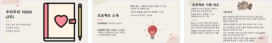 개요 러브 다이어리는 커플들이 함께 사용하여 일상을 기록하고 공유할 수 있는 다이어리 어플리케이션입니다. 커플들이 함께하는 시간과 기억을 기록하며, 앞으로의 계획을 세우고 관리할 수 있도록 돕습니다. 다양한 기능을 통해 커플 간의 유대감을 강화하고, 더 나은 관계를 유지할 수 있도록 합니다.