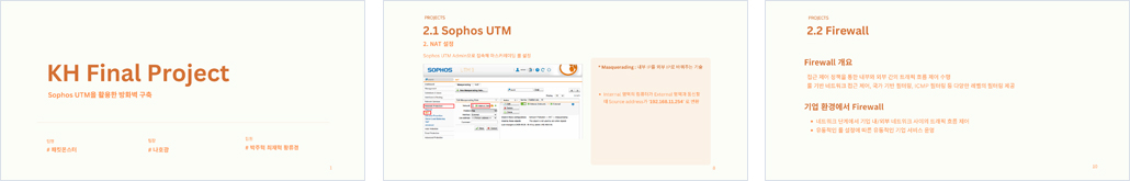개요 최근 들어 원격근무의 일상화와 더불어, 사이버 위협이 갈수록 다양화됨에 따라 기업의 업무망을 보다 정밀하게 보호할 수 있는 네트워크 보안 체계의 필요성이 강조되고 있다. 본 프로젝트는 Sophos UTM이 제공하는 다양한 보안 기능 WAF(Web Application Firewall), ACL(Access Control List), IPS(Intrusion Prevention System), 웹 필터링(Web Filtering), VPN(Virtual Private Network)을 종합적으로 사용하여, 외부로부터의 비인가 접근을 효과적으로 차단하고 내부 자산에 대한 침해를 방지할 수 있는 종합 보안환경 구축을 목표로 한다.