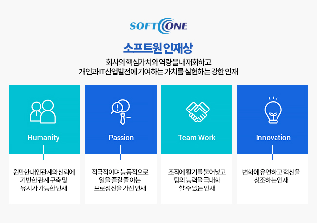 올해로 21년차 IT기업인 소프트원은 패션/유통, 제조, 안면인식 솔루션 등의 자사 솔루션과 안정적인 재무구조, 170명의 정규직을 바탕으로 영역을 날로 확장하며 지속적 으로 성장하고 있습니다. 또한 LG CNS의 프라임파트너로 LG CNS와의 긴밀한 협업은 물론 자사 솔루션을 활용하여 다수의 패션/유통기업, 제조기업을 고객으로 맞이함과 동시에 미래기술로 유망한 안면인식솔루션 분야까지 진출하였습니다.