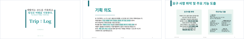 | 개요 | “개발자는 코드를 기록하고, 당신은 여행을 기록한다.” - I UNION I 다양한 사람들이 작성한 여행 후기를 서로 공유할 수 있는 여행 후기 커뮤니티 기반 플랫폼이며, 수많은 사람들의 솔직한 후기를 통해 보다 신뢰할 수 있는 여행 정보를 얻을 수 있는 프로젝트입니다. |
