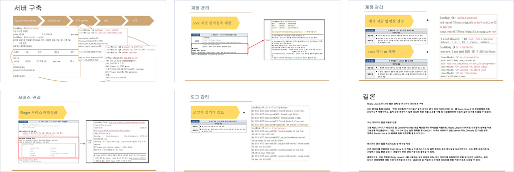 주요 보안 영역(계정 관리, 파일 및 디렉터리 권한, 서비스 관리, 패치 및 업데이트, 로그 관리)에 대해 발생 가능한 보안 침해사례를 분석하고, 해당 위협을 방지하기 위한 설정 방법 및 점검 항목을 정리한다. 실무자가 즉시 활용 가능한 형식으로 정리함으로써, 보안 관리 역량을 실질적으로 향상시키는 것이 본 프로젝트의 핵심이다.